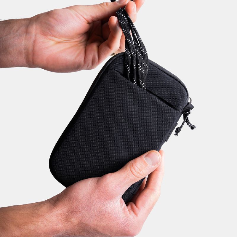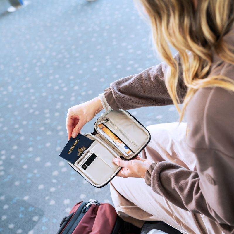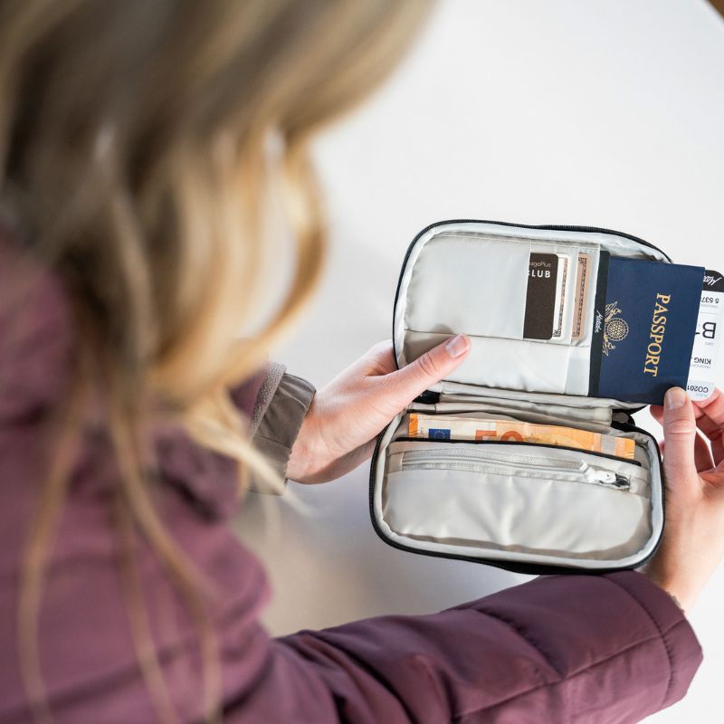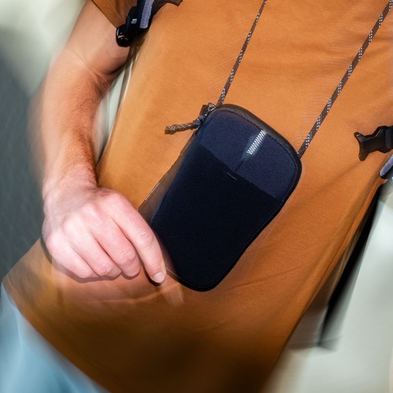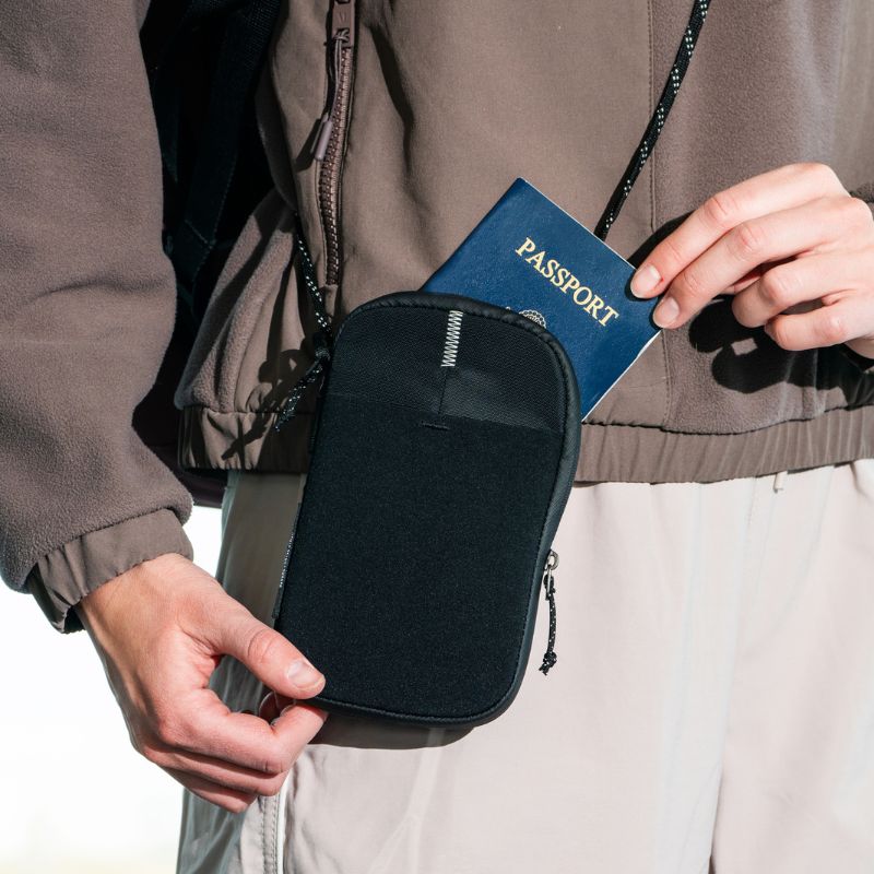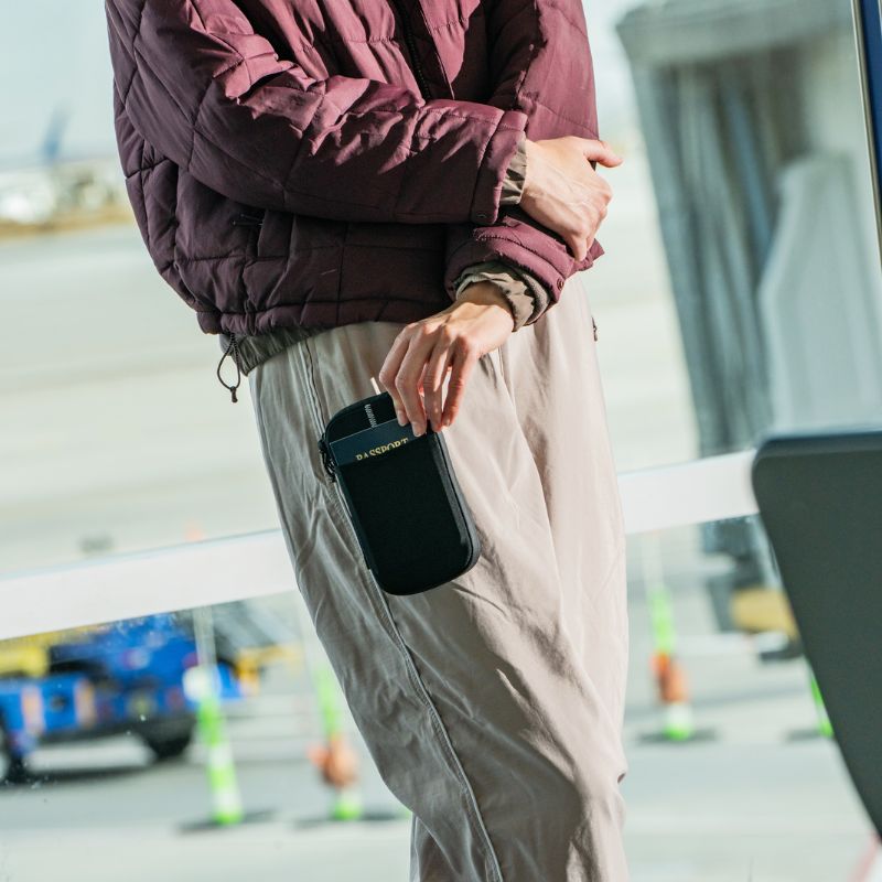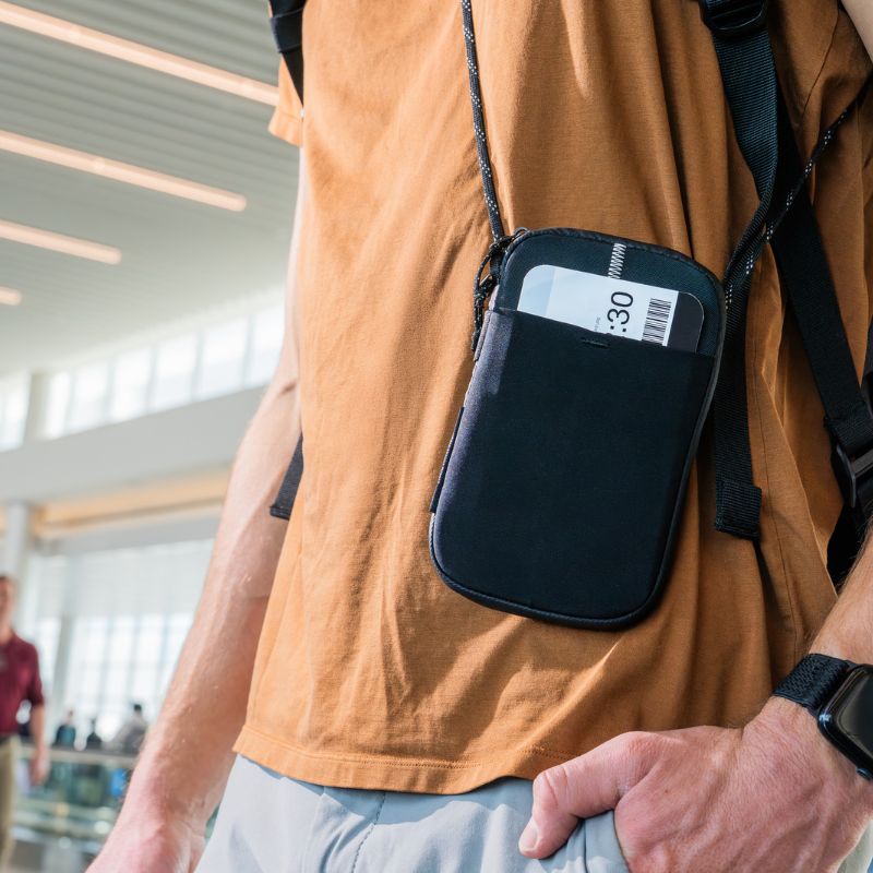 -Quick-access external stash pocket for phone, boarding pass, etc.