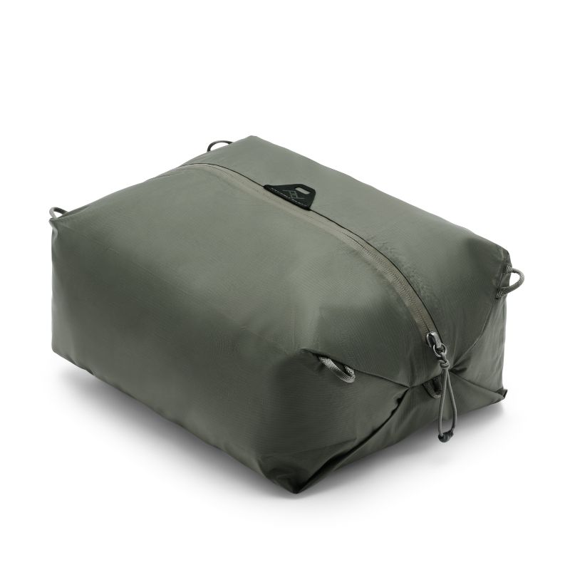 But don't go around calling these cubes simple—thoughtful features are abound. Choose from 2 fabrics: our weatherproof Terra Shell™ 50D material, and our see-through nylon stretch mesh. Terra Shell™ cubes have taped seams and weatherproof UltraZips™ for enhanced water and tear resistance, while the stretch mesh can expand to double the max volume, and is also ideal for things that need to breathe. Turn your cube into an ultralight sling by attaching an adjustable carry strap or PD camera strap (both sold separately) to the Cord Hook™ carry loops. Or mount your cube externally on any Peak Design bag via 2 external carry strap pass-throughs—a whole new dimension to modular organization. When not in use, Ultralight Packing Cubes fold totally flat and can be rolled up and cinched with the elastic zip pull cord. Keep a few of them on hand in your pocket or bag—you'll never stop finding uses for them.